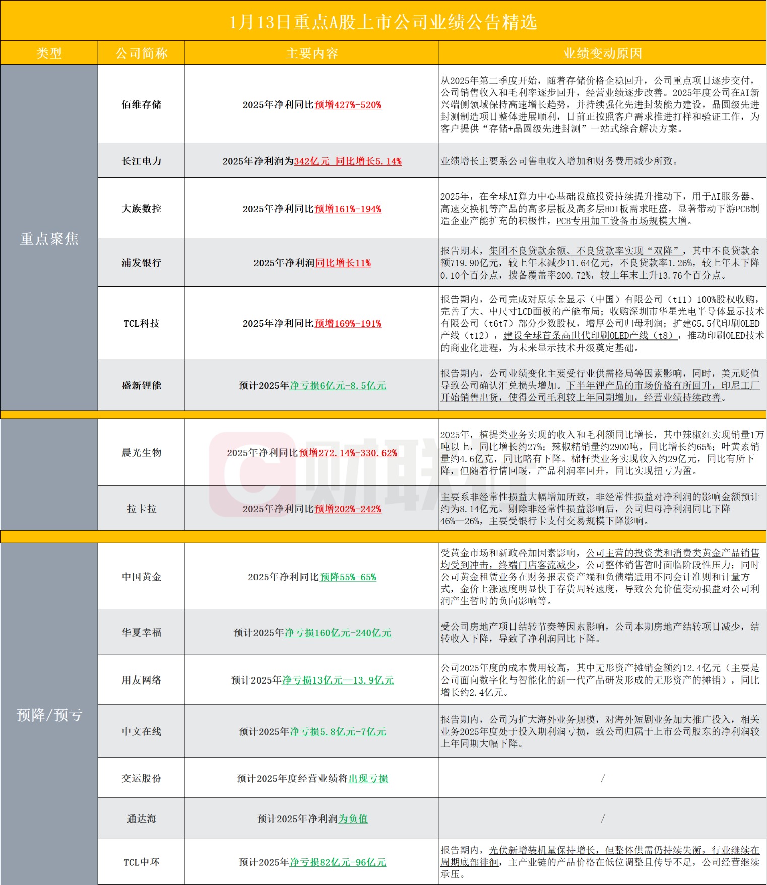 据不完全统计,截至发稿,盘后包括佰维存储、长江电力、大族数控、浦发银行、TCL科技、盛新锂能、晨光生物、拉卡拉、中国黄金、华夏幸福、用友网络、中文在线、交运股份、通达海和TCL中环等多家A股上市公司发布2025年业绩预告或业绩快报。其中,佰维存储2025年净利同比预增427%-520%;长江电力2025年净利润为342亿元,同比增长5.14%。