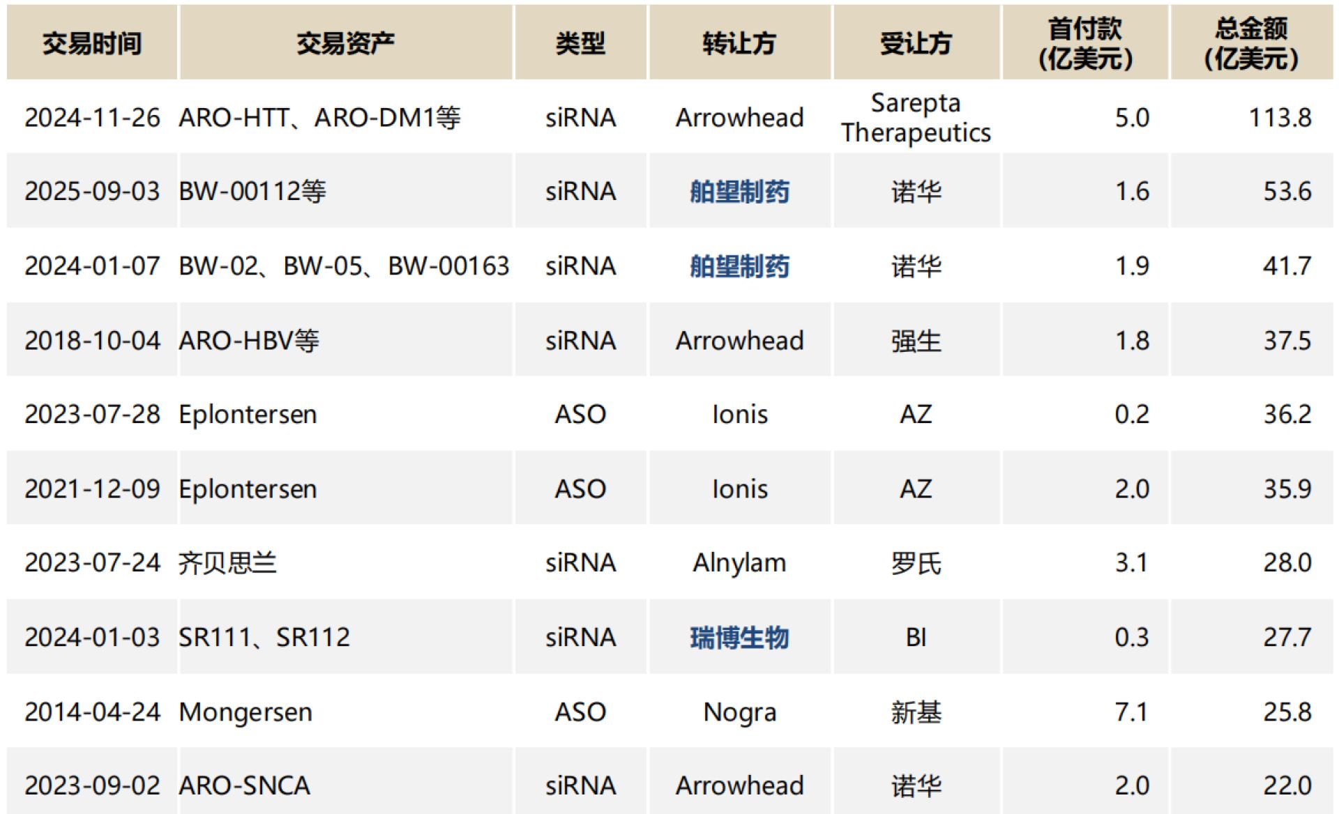 全球小核酸药物BD(商务拓展)交易TOP10,图片来源:爱建证券研报