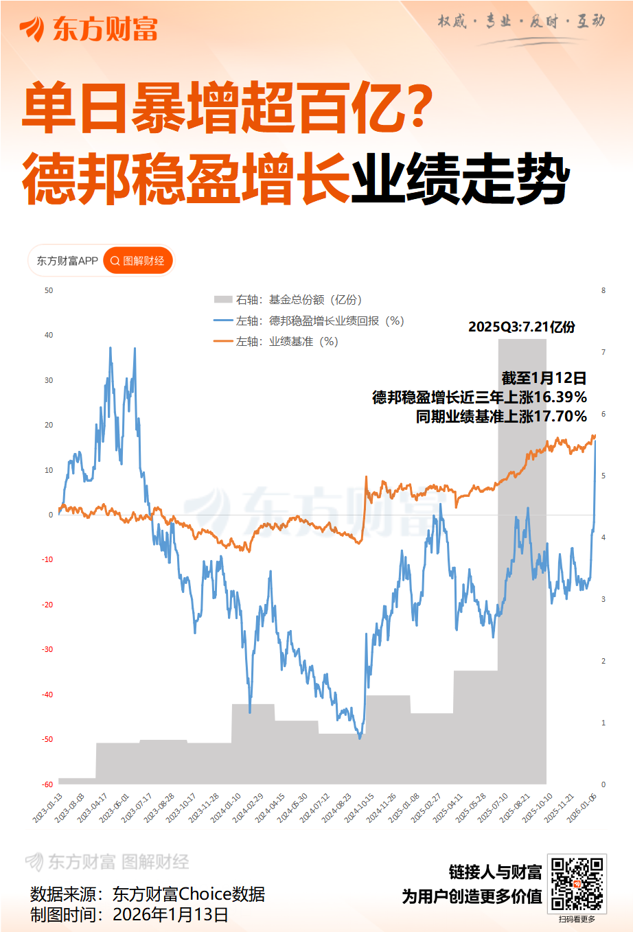 前一日,有市场报道称,1月12日,德邦基金旗下德邦稳盈增长基金在某渠道全天申购额超120亿元。而根据2025年三季报信息,该基金截至2025年9月末,基金规模仅为7.24亿元。市场担忧该基金被巨额资金流入,恐稀释基金收益。