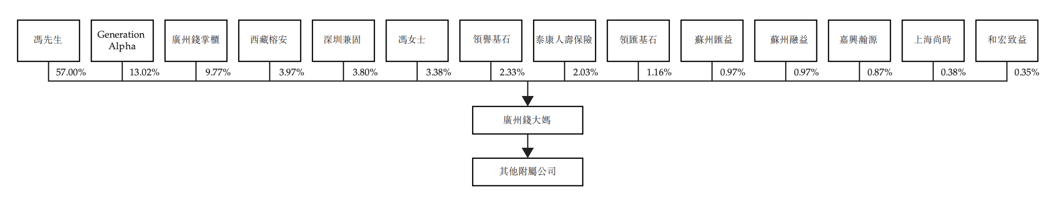 根据招股书,完成D轮融资及相关股权转让后,冯冀生、启承资本、西藏榕安、深圳兼固、冯卫华、领誉基石、泰康人寿保险、领汇基石分别持有广州钱大妈57.00%、13.02%、3.97%、3.80%、3.38%、2.33%、2.03%、1.16%股权。