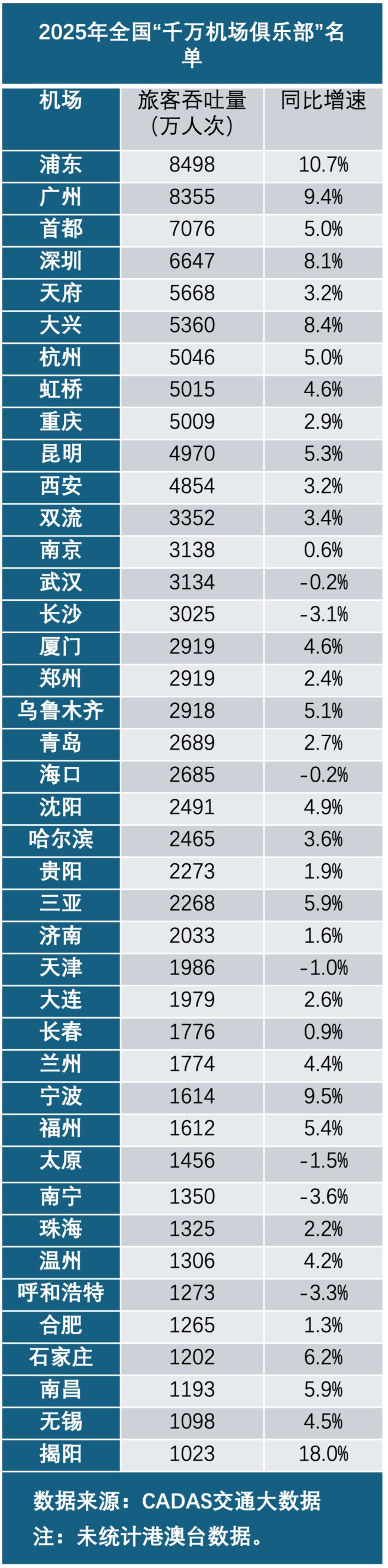 2025年全国航空客运“成绩单”出炉!近日,CADAS交通大数据公布2025年中国内地机场(未统计港澳台地区,下同)旅客吞吐量数据,全国最繁忙机场名单迎来重新“洗牌”。