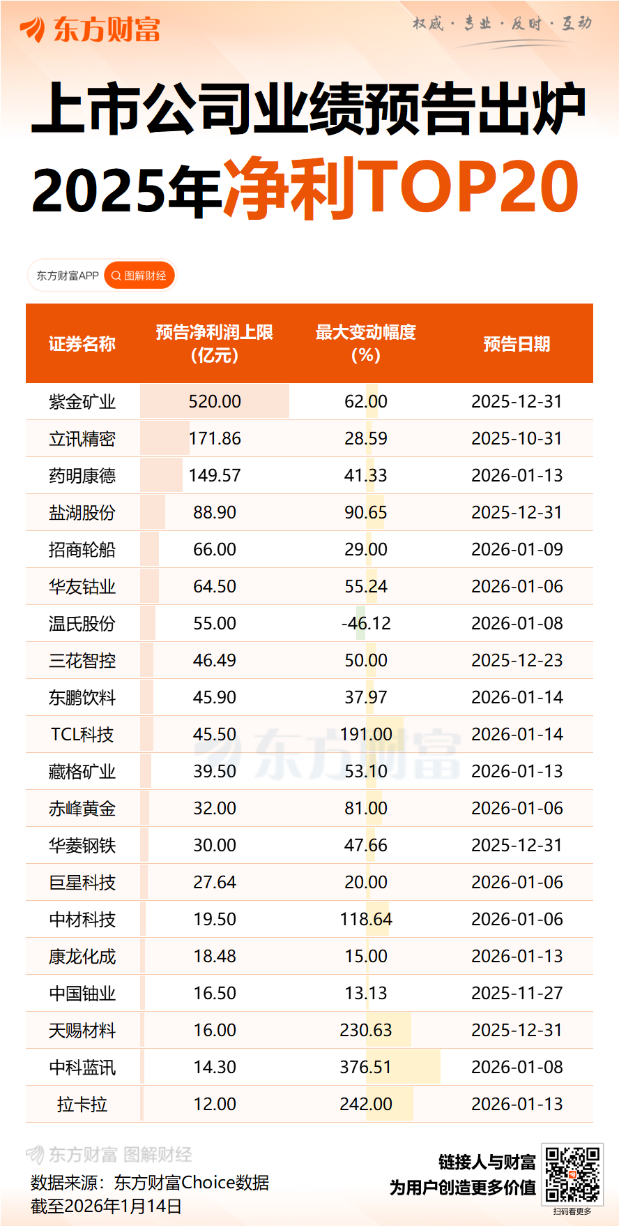 1月13日晚间,预计2025年净利同比大幅增长的公司还有晨光生物、TCL科技、大族数控、沃华医药、豪鹏科技等。