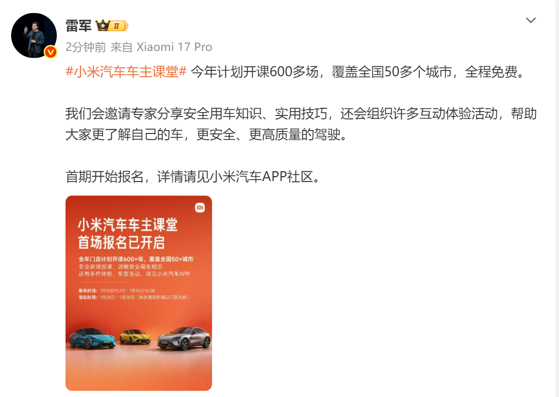 小米创办人、董事长兼CEO雷军1月14日在微博发文表示,小米汽车车主课堂今年计划开课600多场,覆盖全国50多个城市,全程免费。