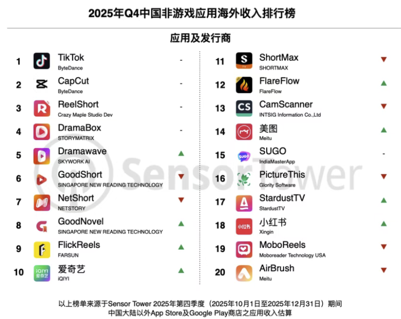 1月14日,Sensor Tower最新数据显示,2025年全球短剧应用内购收入突破28亿美元,同比涨幅高达116%,短剧已从新兴内容形态快速演进为具备全球规模效应的成熟商业模式。2025年Q4非游戏应用出海收入榜TOP20中,短剧应用占据半壁江山。另外,DramaBox在2025年全球收入大幅上涨75%至5.3亿美元,上市至今累计收入达8.5亿美元;2025年该应用下载量同比激增112%,跃居2025年全球短剧应用下载榜冠军。