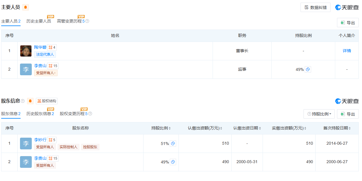 天眼查信息显示,早在2014年6月,老干妈的创始人及法定代表人陶华碧便退出了股东阵营。此后由陶华碧的长子李贵山持股49%,次子李妙行持股51%,李妙行现为实际控制人。
