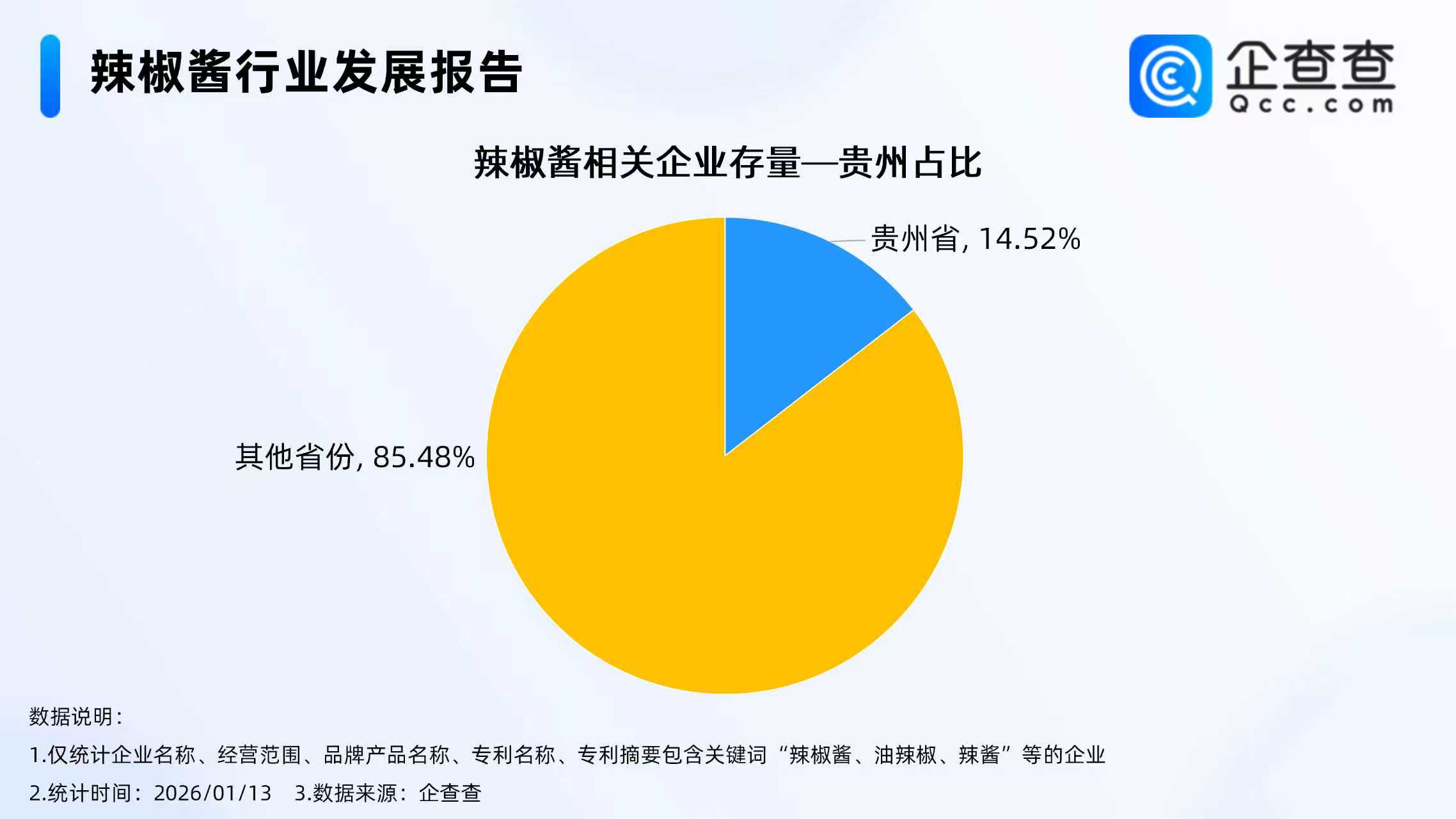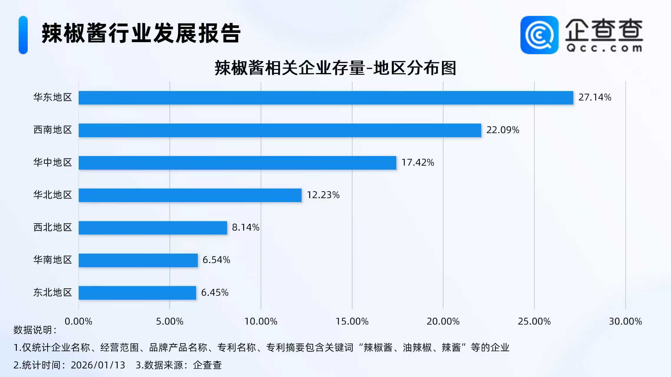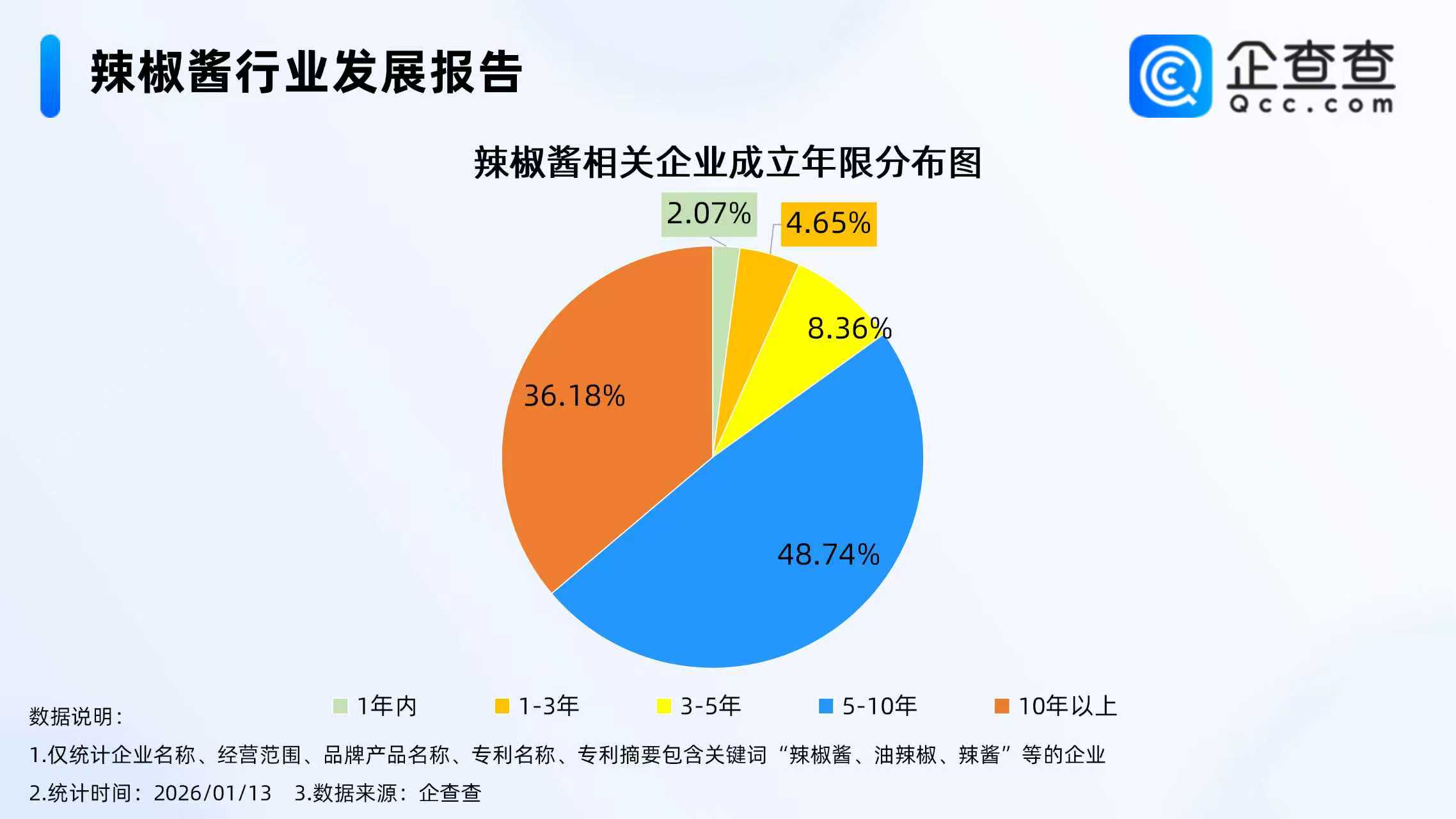 企查查数据显示,截至1月13日,国内现存辣椒酱相关企业5723家,从经营时间来看,辣椒酱相关企业多为老牌企业,成立年限在5年以上的相关企业占比超八成,其中在成立年限5-10年的相关企业最多,占比48.74%。从省份分布来看,分布在贵州省的辣椒酱相关企业最多,占全国存量的14.52%。从地区分布来看,分布在华东地区的辣椒酱相关企业最多,占比27.14%。