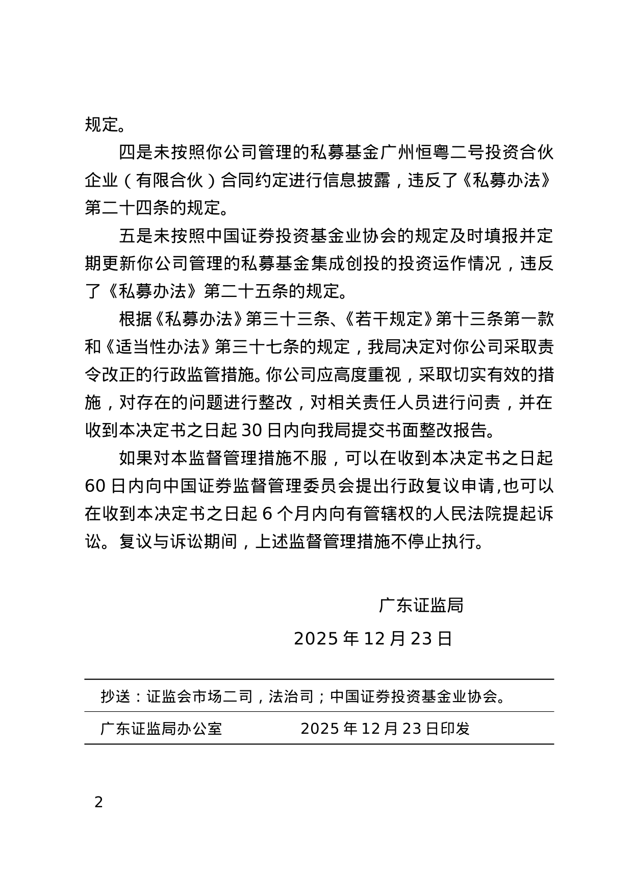 四是未按照公司管理的私募基金广州恒粤二号投资合伙企业(有限合伙)合同约定进行信息披露;
