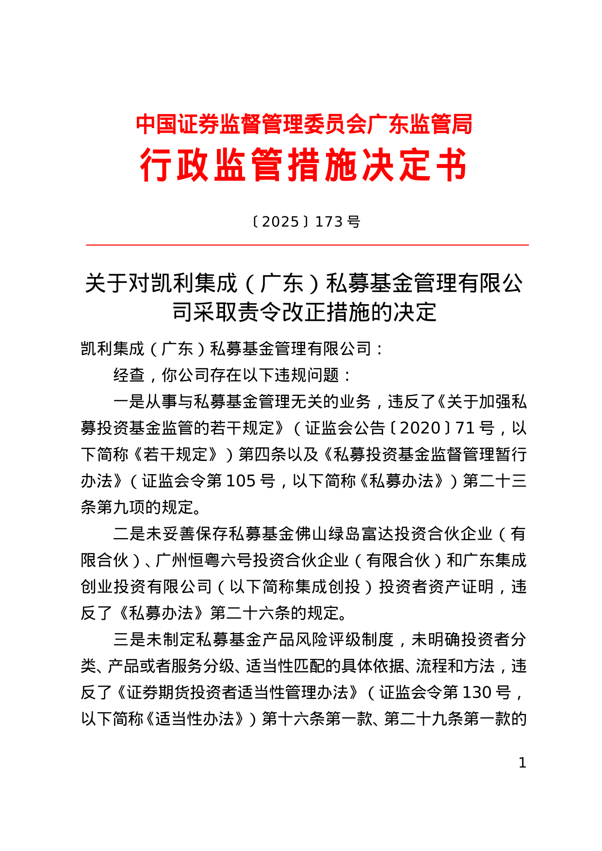 以上行为违反了《关于加强私募投资基金监管的若干规定》《私募投资基金监督管理暂行办法》《证券期货投资者适当性管理办法》的规定。广东证监局决定对凯利集成(广东)私募基金管理有限公司采取责令改正的行政监管措施。