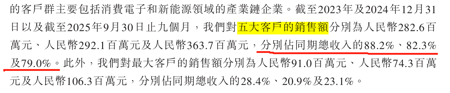 招股书显示,2023年、2024年及2025年前九个月,公司前五大客户的销售贡献额占比分别高达88.2%、82.3%及79.0%。这种极度倾斜的收益结构,使得公司在消费电子市场波动剧烈、产品生命周期缩短的背景下,任何一家核心客户的流失或采购策略的调整,都可能对业绩造成影响。