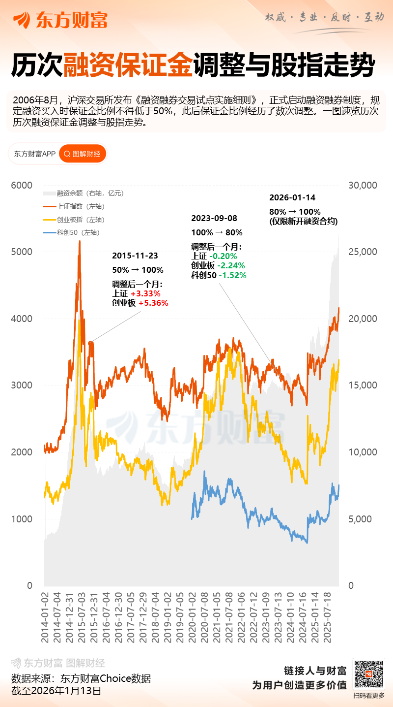 1月14日,沪深北交易所发布通知调整融资保证金比例,将投资者融资买入证券时的融资保证金最低比例从80%提高至100%,此次调整仅限于新开融资合约。