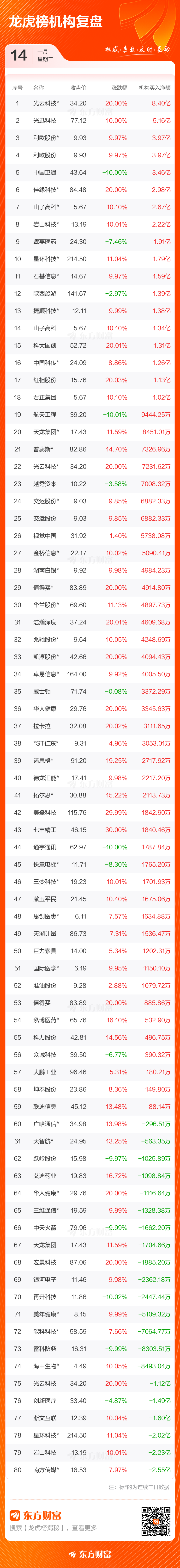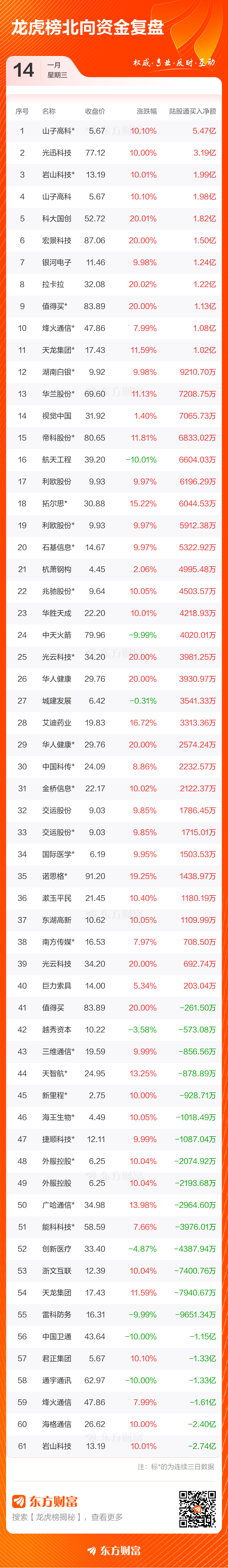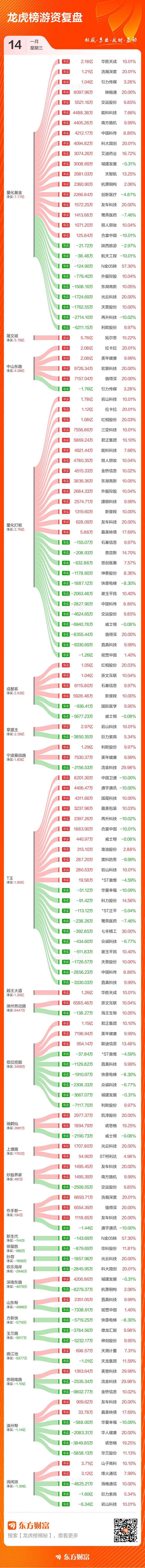 1月14日共有101只个股(含2只可转债)上榜龙虎榜,总上榜成交额523.73亿元。上榜个股中净买入额最高的是山子高科,金额为16.21亿元。