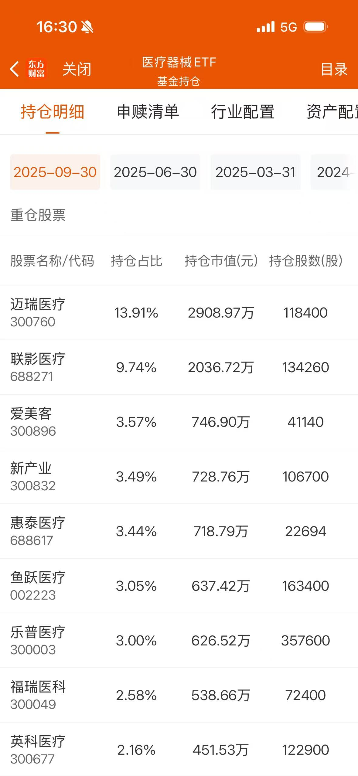 医疗器械ETF(562600),该基金跟踪中证全指医疗器械指数,成分股中脑机接口权重合计高达23.8%(同类最高)。同时,其医疗器械行业占比达89.2%,重仓股囊括迈瑞医疗、联影医疗、迪安诊断等行业龙头,精准捕捉细分赛道爆发红利。