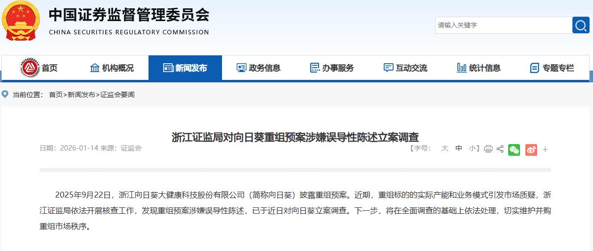 2025年9月22日,浙江向日葵大健康科技股份有限公司(简称向日葵)披露重组预案。近期,重组标的的实际产能和业务模式引发市场质疑,浙江证监局依法开展核查工作,发现重组预案涉嫌误导性陈述,已于近日对向日葵立案调查。下一步,将在全面调查的基础上依法处理,切实维护并购重组市场秩序。
