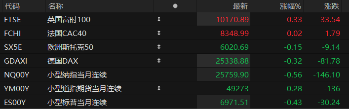 周三盘前,美股三大股指期货齐跌,欧洲主要指数涨跌不一。截至发稿,纳斯达克100指数期货跌0.56%,道指期货跌0.28%,标普500指数期货跌0.43%。