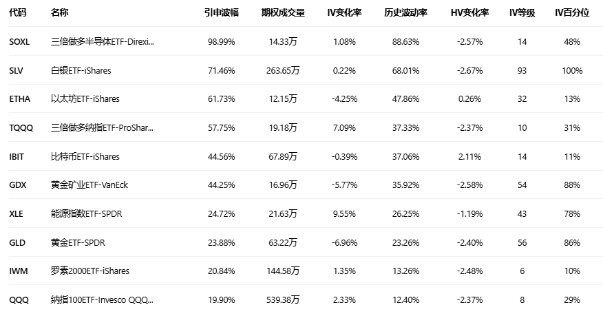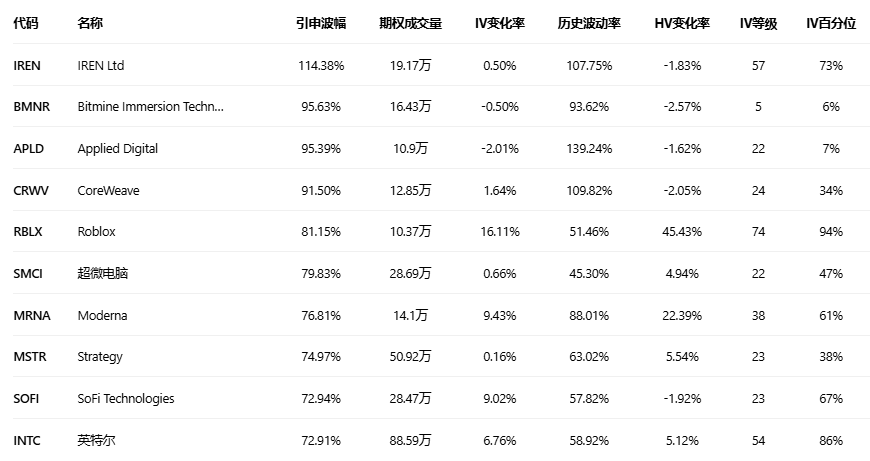 引申波幅排行榜(标的市值>10亿美元,且期权成交量>10万)