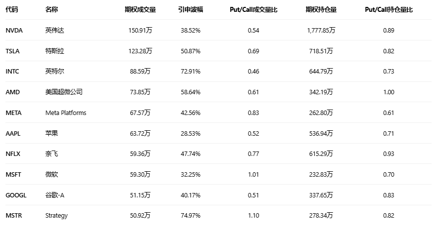期权成交量前10的股票中,微软的看跌/看涨成交量比最高,达到1.01。