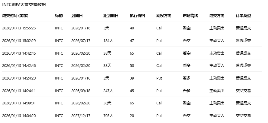 英特尔收涨7.33%,成交88.59万份期权合约,看跌/看涨成交量比降至0.46。
