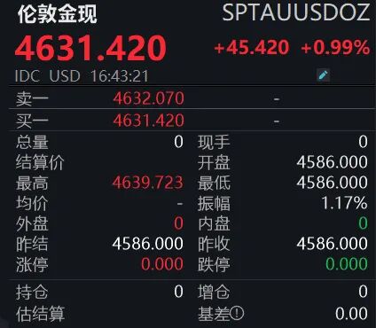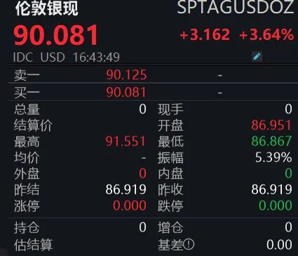 现货市场方面,截至发稿,伦敦金现日内涨幅0.99%,报4631.42美元/盎司,盘中最高触及4639.723美元/盎司,创历史新高;伦敦银现攻势更猛,日内飙升3.64%,首次站上90美元/盎司整数关口,并上探91.1551美元。