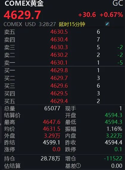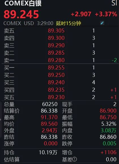 期货市场同步跟涨,截至发稿,COMEX黄金期货日内上涨0.67%,报4629.7美元/盎司,盘中最高触及4647.6美元/盎司;COMEX白银期货日内大涨3.37%,报89.245美元/盎司,最高触及91.37美元/盎司。两大品种均刷新历史纪录,与现货市场形成强势共振。