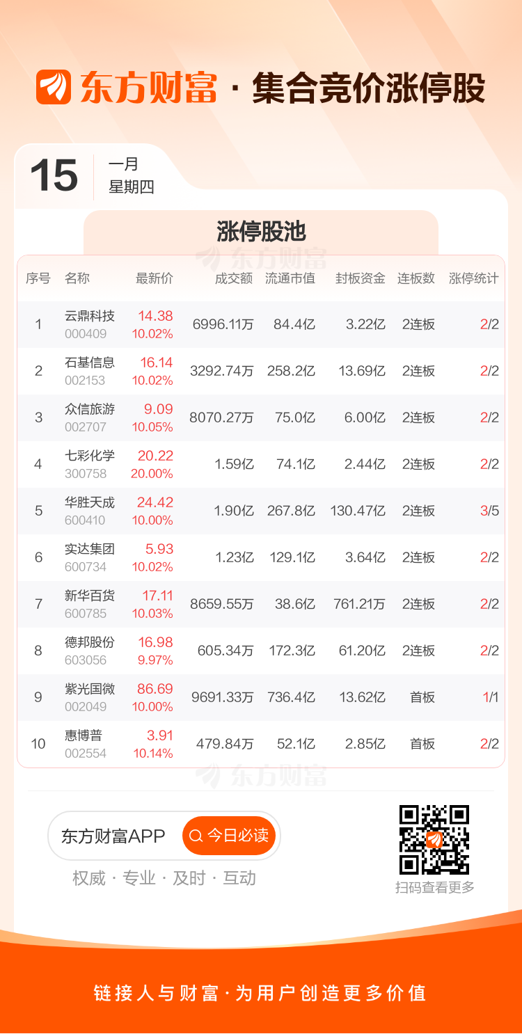 1月15日集合竞价:云鼎科技、石基信息2连板