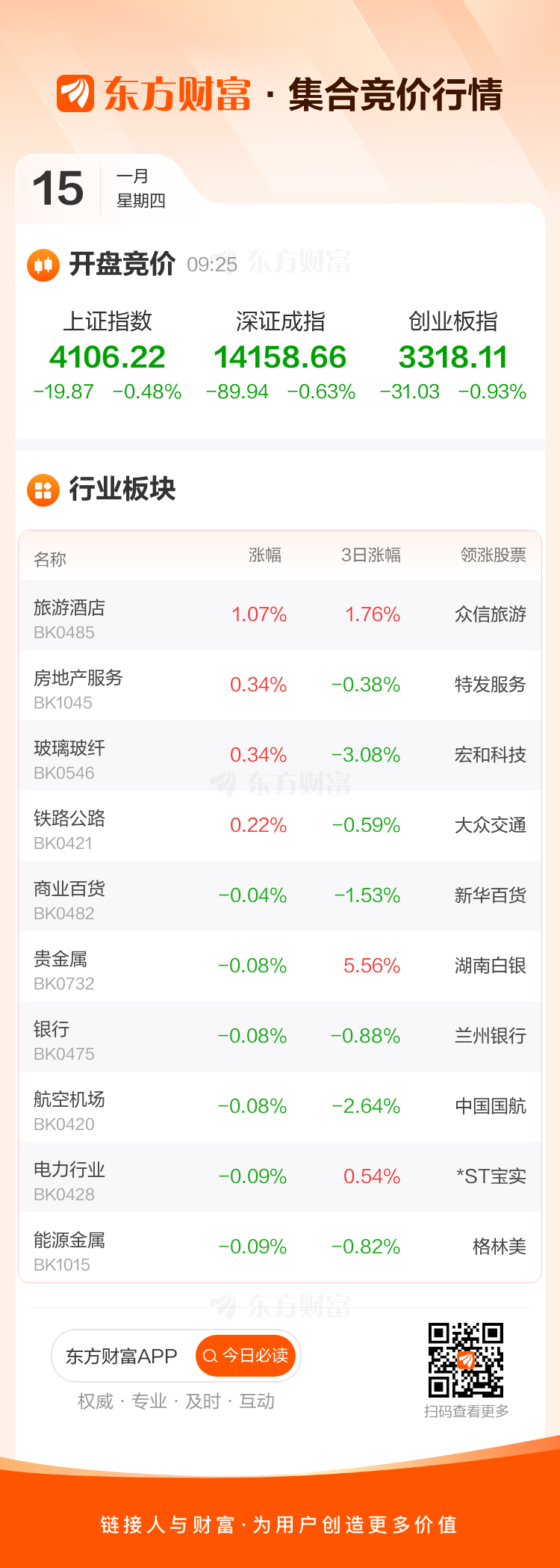 1月15日,三大指数集体低开,上证指数低开0.48%,深证成指低开0.63%,创业板指低开0.93%。板块方面,旅游酒店领涨,众信旅游涨10.05%,房地产服务、玻璃玻纤等开盘涨幅居前。