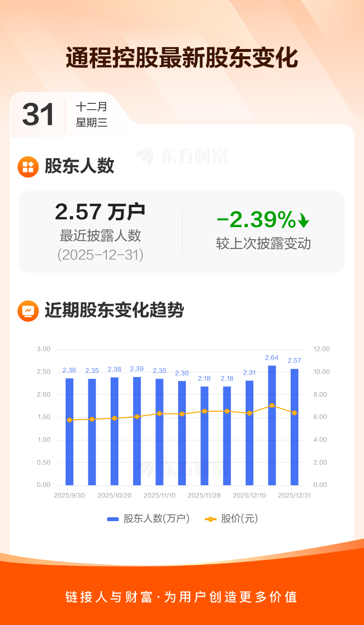 通程控股最新披露数据显示,截至12月31日公司股东户数为2.57万户,较上期(2025年12月20日)减少630户,降幅为2.39%。户均持有流通股数量由上期的2.06万股上升至2.11万股,户均持股金额由上期的14.54万元减少至13.50万元。
