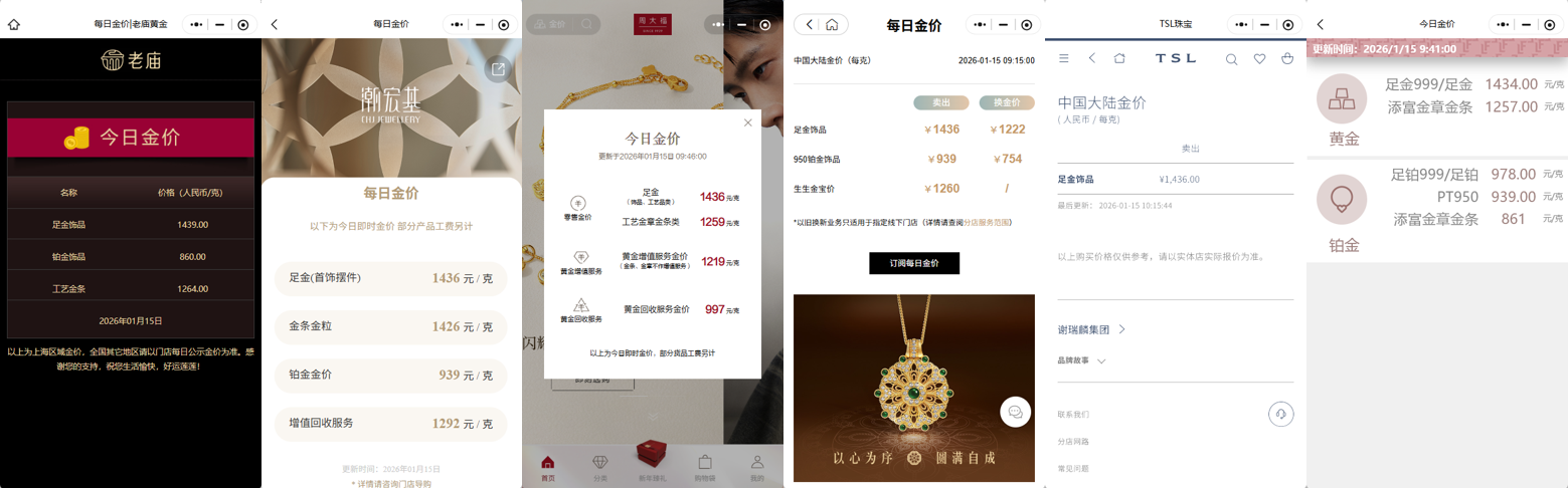 1月15日,多家黄金珠宝品牌公布的境内足金饰品价格出现分歧。部分品牌仍保持价格和前一日持平,还有部分品牌公布的金饰价则出现下调或上调,上调后的较高者已至1439元/克。