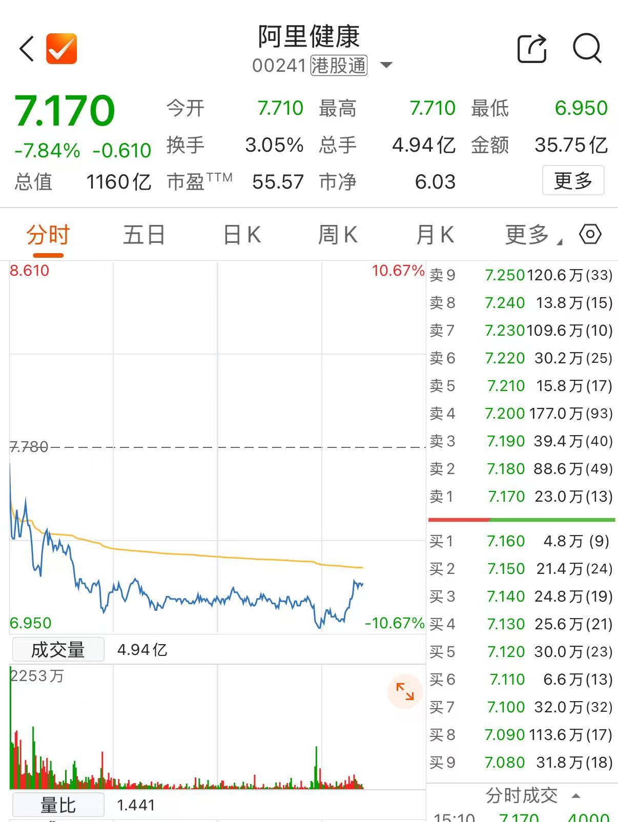 上证报中国证券网讯(记者徐潇潇)1月15日,港股AI医疗概念股走弱,阿里健康一度跌超10%。截至15时10分,阿里健康跌7.84%,报7.17港元/股。