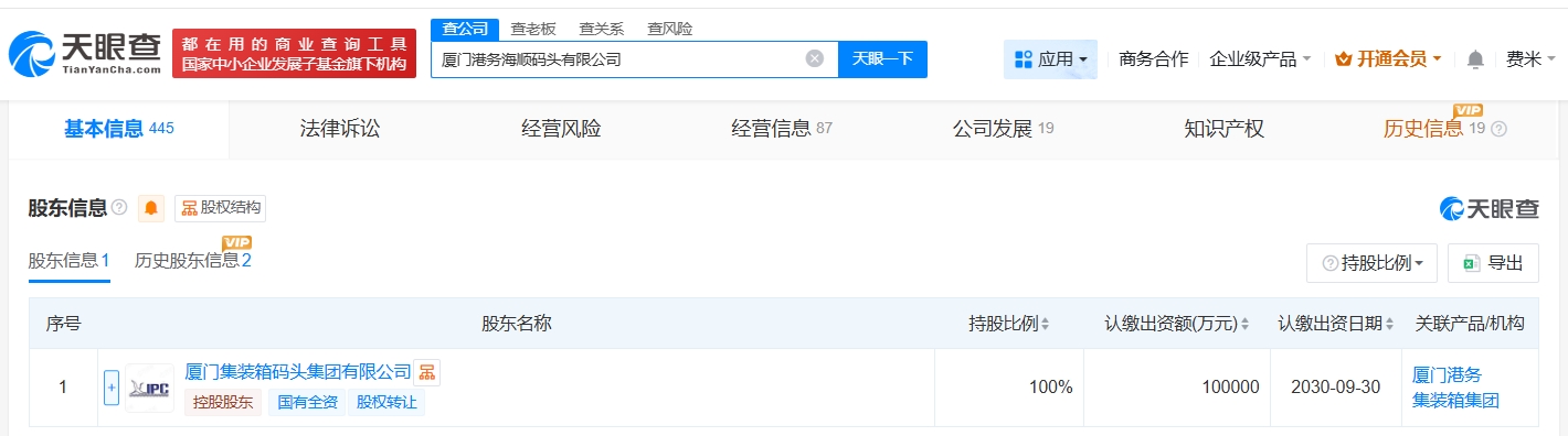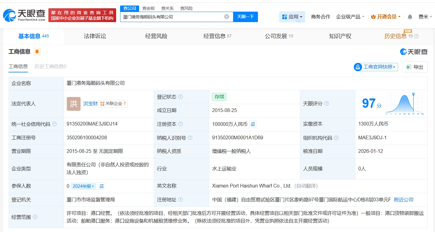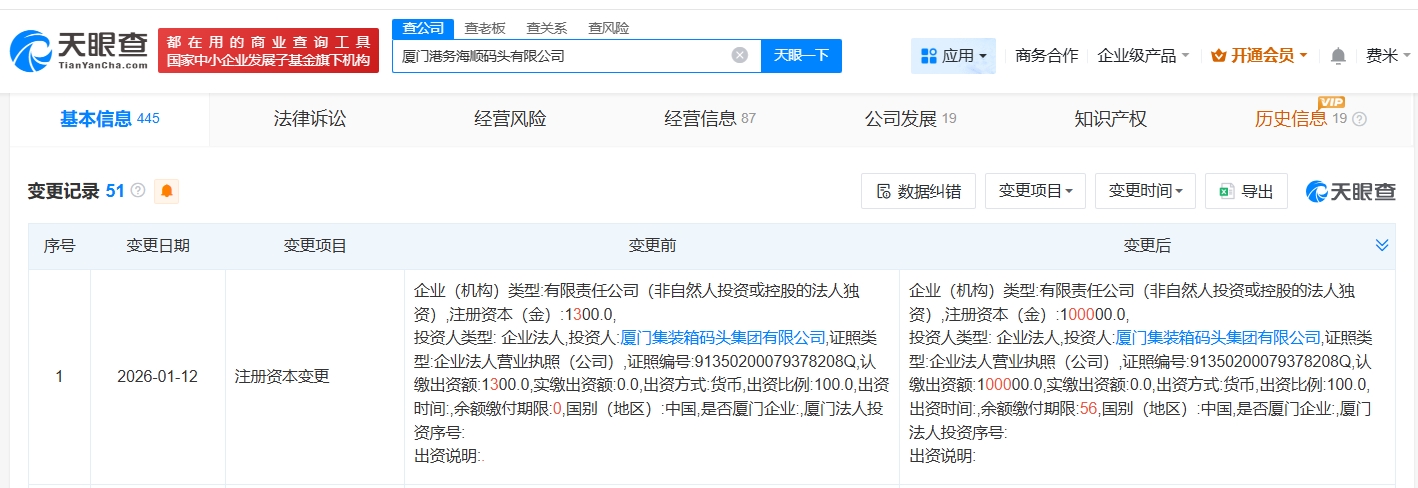 每经AI快讯,1月15日,天眼查工商信息显示,近日,厦门港务海顺码头有限公司发生工商变更,注册资本由1300万元人民币增至10亿元人民币,增幅约7592%。厦门港务海顺码头有限公司成立于2015年8月,法定代表人为洪宝财,经营范围为港口经营、港口货物装卸搬运活动、船舶港口服务、港口设施设备和机械租赁维修业务。股东信息显示,该公司由厦门集装箱码头集团有限公司全资持股。