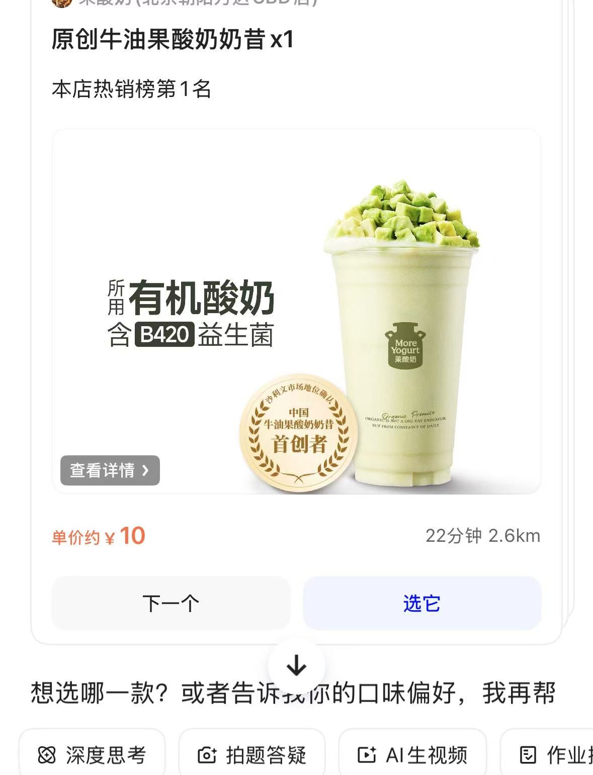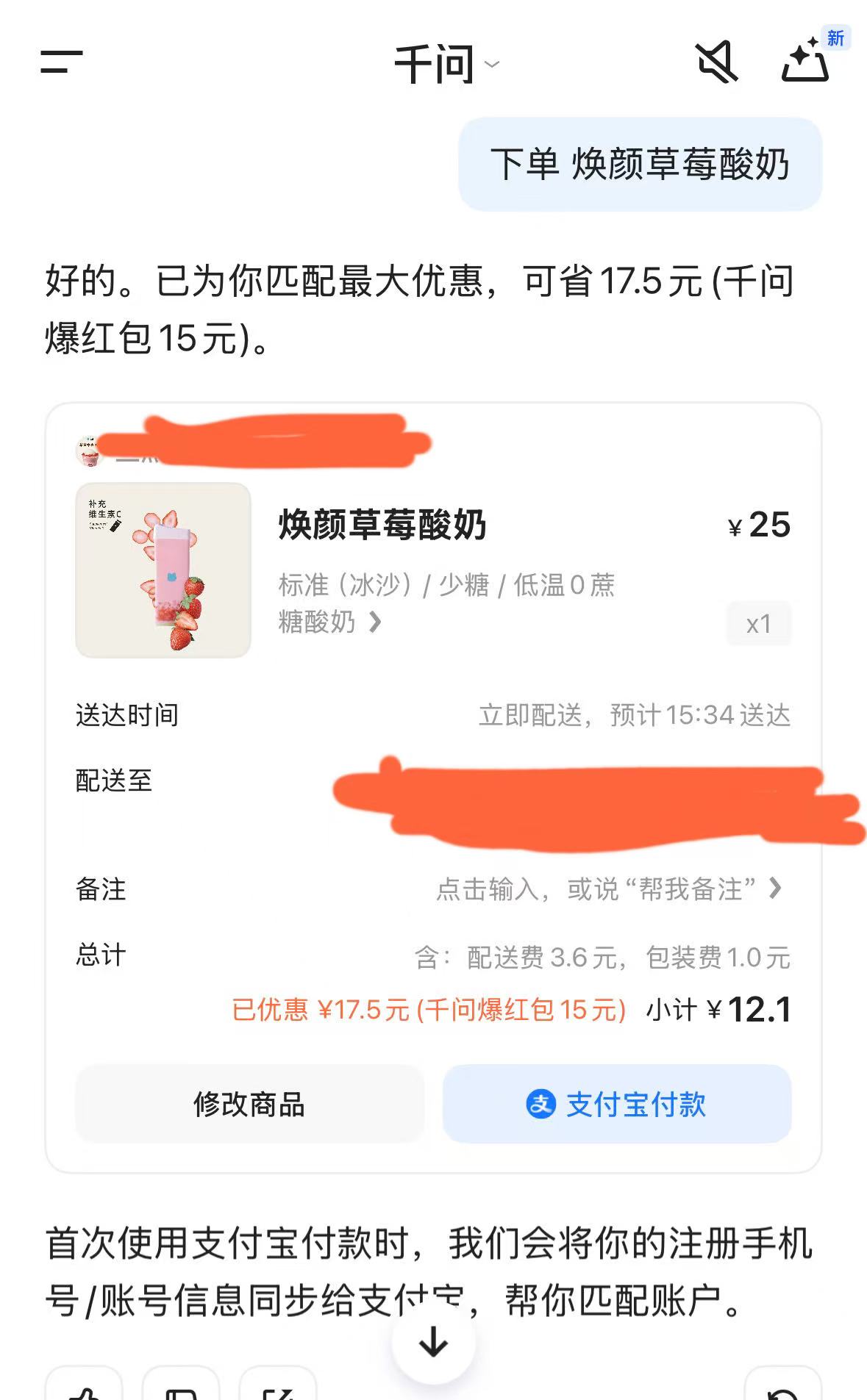 1月15日下午,界面新闻记者登录千问App,绑定了与支付宝关联的账号后,在对话框要求搜索附近有优惠的酸奶店,随后千问显示了附近的酸奶店热销第一名产品,再进一步要求特定草莓口味后,又显示了附近商家符合口味的产品。点击“选它”选项后,立刻出现了支付和配送信息页面,原本售价25元的酸奶,在减去包括15元千问爆红包的优惠共17.5元后,支付价格仅为12.1元。