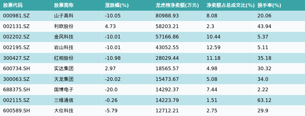 21智讯1月15日电,南财金融终端数据显示,因当日异动登上龙虎榜的个股中,龙虎榜中资金净流出最多的前三位分别是山子高科(000981.SZ)、利欧股份(002131.SZ)与金风科技(002202.SZ)。其中排名第一的山子高科被净卖出8.1亿元,占总成交金额的8.08%。山子高科收盘下跌10.05%,换手率为20.06%。净卖出额前10个股详情见下图: