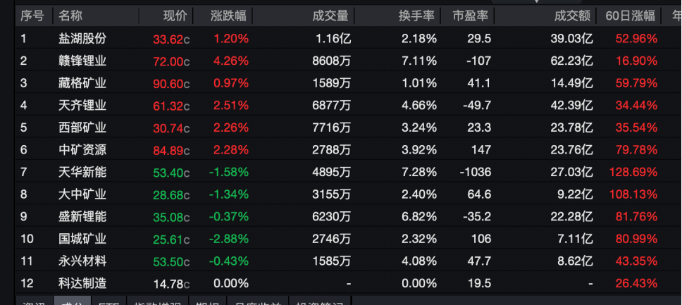 截至1月15日A股收盘,锂矿概念股盐湖股份(000792.SZ)、赣锋锂业(002460.SZ)、藏格矿业(000408.SZ)、天齐锂业(002466.SZ)、西部矿业(601168.SH)、中矿资源(002738.SZ)60日涨幅,分别达到了52.96%、16.90%、59.79%、34.44%、35.54%和79.78%。