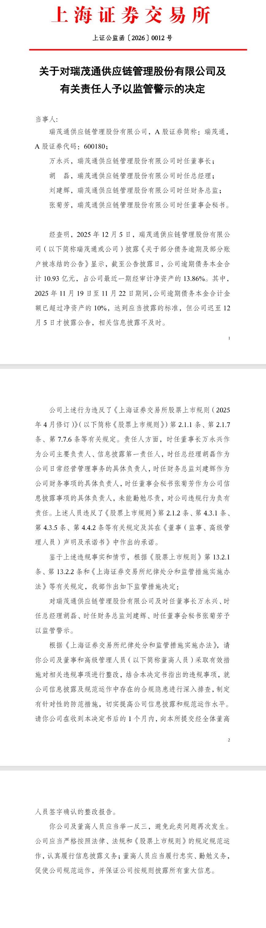 上交所对瑞茂通及有关责任人予以监管警示。