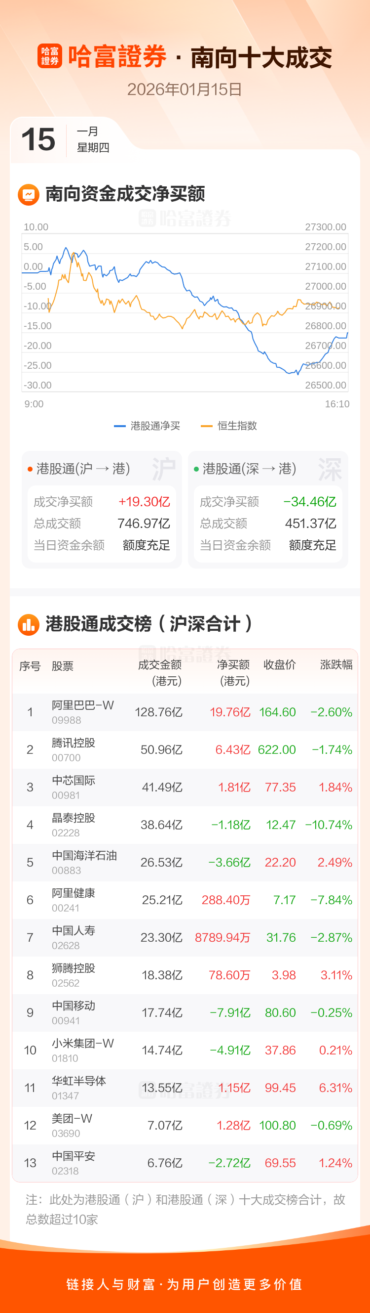 恒生指数1月15日跌0.28%,收报26923.62点。南向资金今日净卖出港股15.15亿港元。南向资金今日成交额1198.34亿港元,港股大市成交2904.55亿港元。
