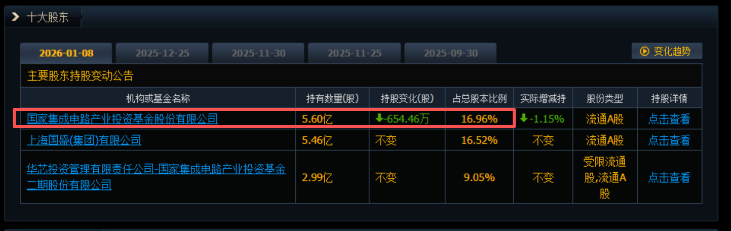 注:截至1月8日,国家集成电路产业投资基金股份有限公司持有沪硅产业16.96%股份,为公司的第一大股东。沪硅产业2025年10月23日公告,第一大股东国家集成电路产业投资基金计划减持不超2%公司股份。