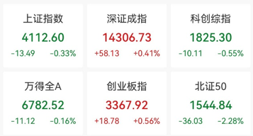 今日(1月15日),A股全天震荡调整。截至收盘,沪指下跌0.33%,最新报4112.6点;深证成指涨0.41%,创业板指涨0.56%。今日市场成交29384.94亿元,较昨日缩量10483.68亿元。