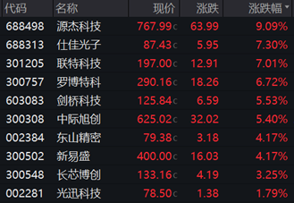 今日午后,CPO概念指数涨幅超过3.4%。成份股中,源杰科技大涨9.09%;仕佳光子、联特科技涨逾7%;罗博特科、剑桥科技、中际旭创等多股跟涨,幅度均在5%以上。