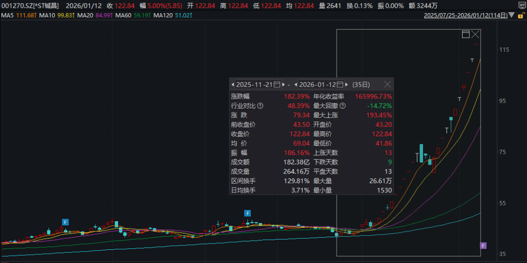 行情数据显示,自2025年11月下旬以来,*ST铖昌股价累计涨幅超过180%。本次停牌前7个交易日,公司股票连续涨停。