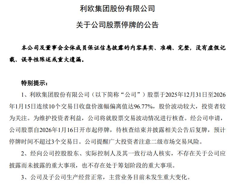利欧股份公告称,公司股票于2025年12月31日至2026年1月15日连续10个交易日收盘价涨幅偏离值达96.77%,为维护投资者利益,公司将就股票交易波动情况进行核查。经公司申请,公司股票自2026年1月16日开市起停牌,待核查结束并披露相关公告后复牌,预计停牌时间不超过3个交易日。此外,公司AI相关业务收入占比较小,对整体业绩影响不大。公司未发现其他可能对股价产生重大影响的事项。