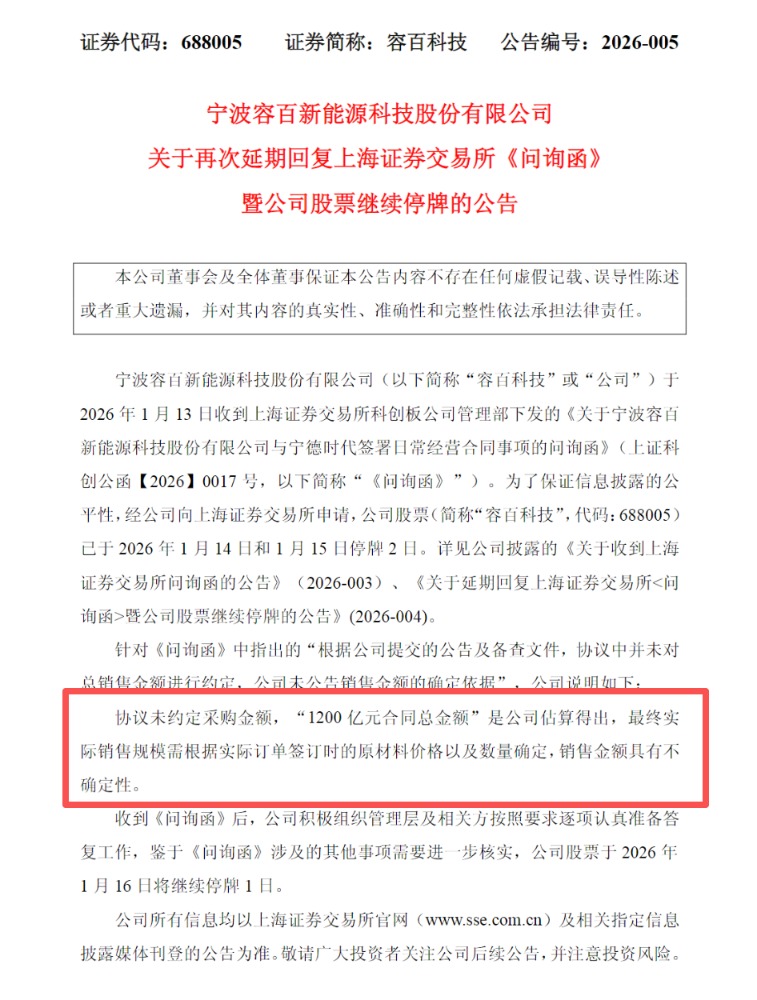 公告中,容百科技表示鉴于《问询函》涉及的其他事项需要进一步核实,公司股票于2026年1月16日将继续停牌1日。