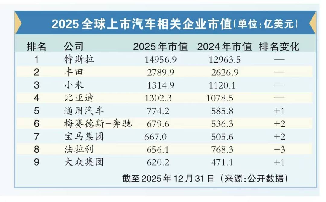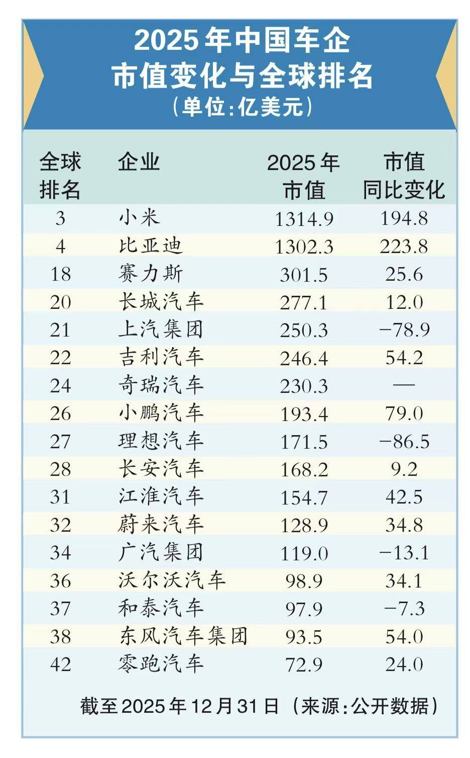2025年,中国车企在全球舞台表现亮眼。小米以1314.9亿美元的市值微超比亚迪的1302.3亿美元。机构分析认为,两者的位置变化,凸显“生态溢价”与“制造溢价”已成为市场新的估值逻辑差异。