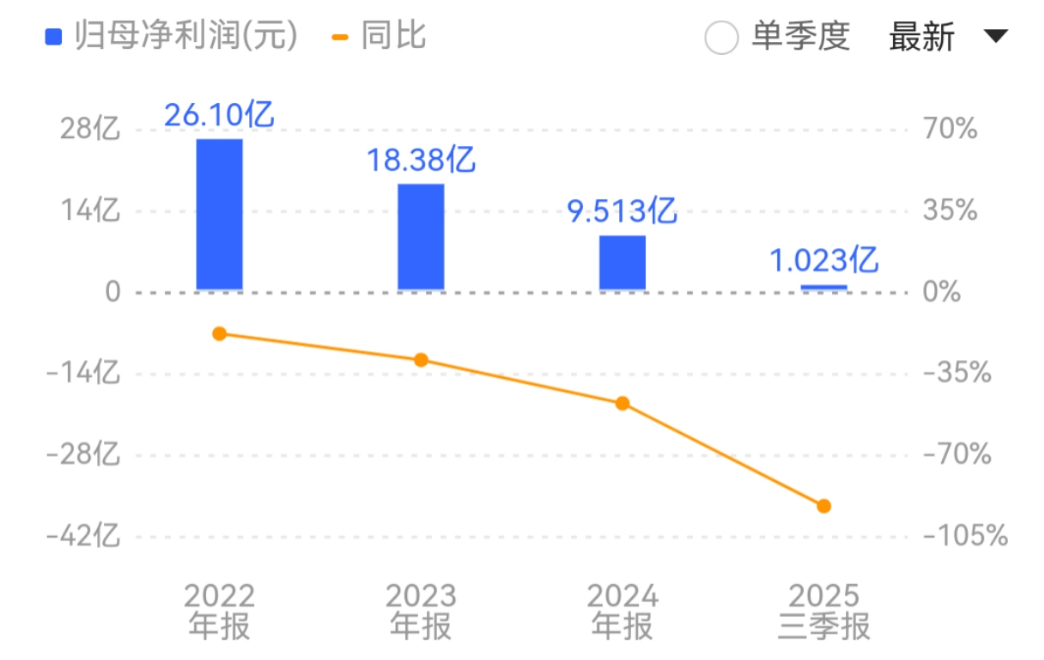 纵观近年业绩,华发股份净利润已连续三年下滑,2025年前三季度更是同比大降九成。2021年至2024年,公司归母净利润分别为31.95亿元、26.10亿元、18.38亿元、9.51亿元。