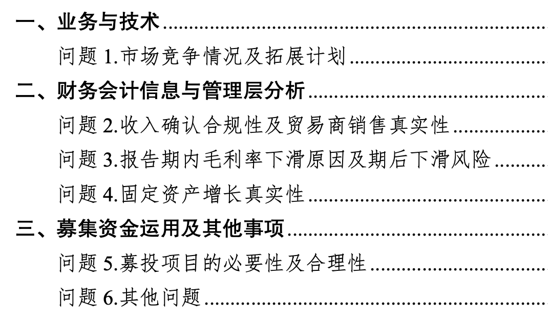 问询函围绕公司的业务与技术、财务会计信息、募集资金运用等多个维度,共计提出六大类问题。