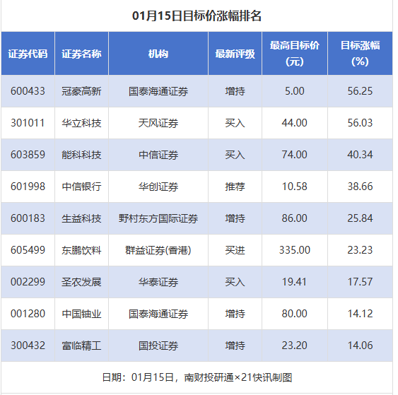 南财投研通数据显示,1月15日,券商给予上市公司目标价共9次,按最新收盘价计算,目标价涨幅排名居前的公司有冠豪高新、华立科技、能科科技,目标价涨幅分别为56.25%、56.03%、40.34%,分别属于造纸、文娱用品、IT服务行业。