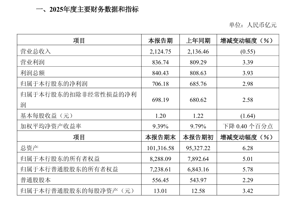 相较于规模的显性跨越,中信银行2025年的经营数据更藏着当前银行业发展的深层逻辑——营业收入与净利润的“非对称走势”,成为行业转型期的典型注脚。业绩快报显示,2025年全年,中信银行实现归属于本行股东的净利润706.2亿元,同比增长3%;与之形成对比的是,同期营业总收入为2124.8亿元,同比微降0.6%。这种“收入微降、利润增长”的背离态势,并非个例,而是近年来银行业在净息差持续收窄背景下,通过精细化经营寻求突破的真实写照。