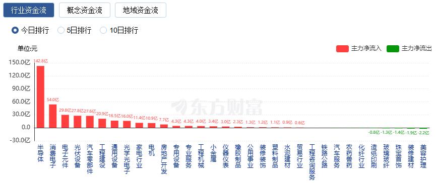 行业资金方面,截至收盘,半导体、消费电子、电子元件等净流入排名靠前,其中半导体净流入142.8亿。