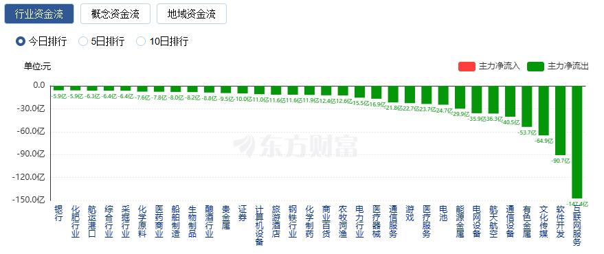 净流出方面,互联网服务、软件开发、文化传媒等净流出排名靠前,其中互联网服务净流出147.4亿元。