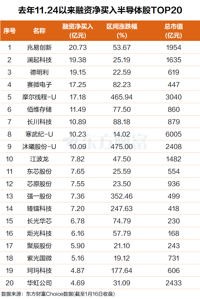 期间融资客抢筹了一批板块个股,具体来看,兆易创新排名第一,融资净买入21亿元;澜起科技排名第二,融资净买入超19亿元。
