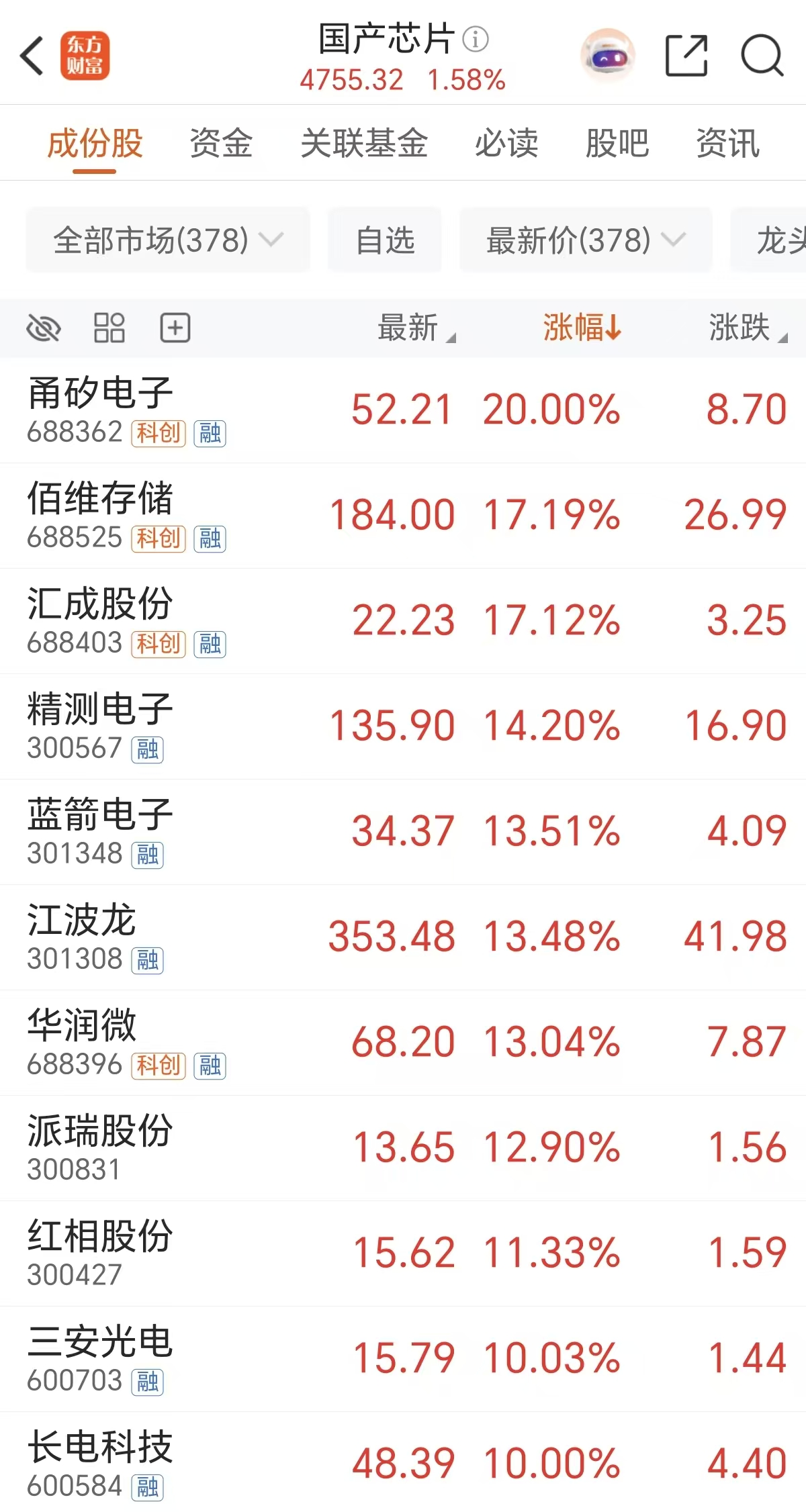 周五(1月16日)国产芯片概念股爆发,甬矽电子20CM涨停,佰维存储、汇成股份等涨超17%,精测电子、江波龙、华润微、派瑞股份等涨超12%。