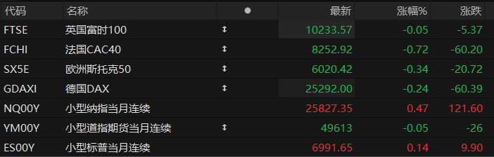 周五盘前,美股三大股指期货震荡盘整,欧洲主要指数普遍下跌。截至发稿,纳斯达克100指数期货涨0.47%,道指期货跌0.05%,标普500指数期货涨0.14%。